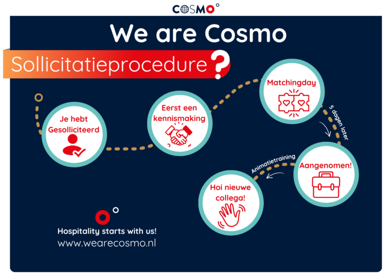Leuk dat je die stap hebt gezet. Na je sollicitatie nemen wij contact met je op voor een kennismaking. Is er een match? Dan nodigen we je uit voor één van onze Matchingdays en ontdek je of Cosmo bij jou past